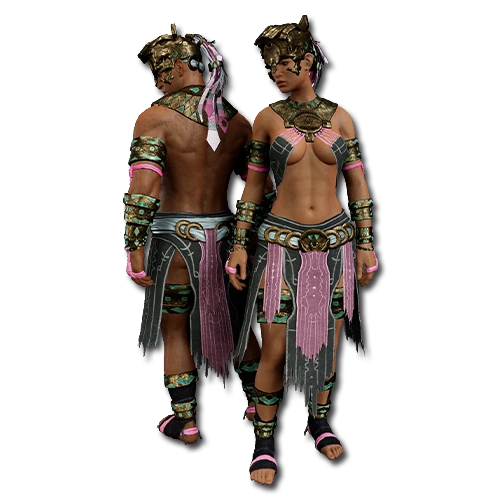 In the shadows of ancient jungles, it is believed that mystical divination through the power of sacrifice can unlock the secrets of the future, and that same power can be turned upon your enemies to confuse or deceive. This ceremonial armor is designed to prophesy and beguile in equal measure.