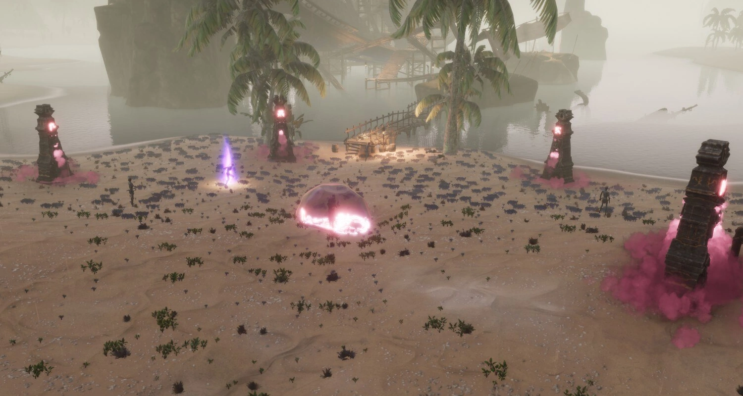 When the site is approached, a summoner can be found protected by an invincible barrier and several totems will rise out of the ground. Hostile undead enemies will periodically be summoned near the totems and corrupting mist will billow from the totems' mouths.